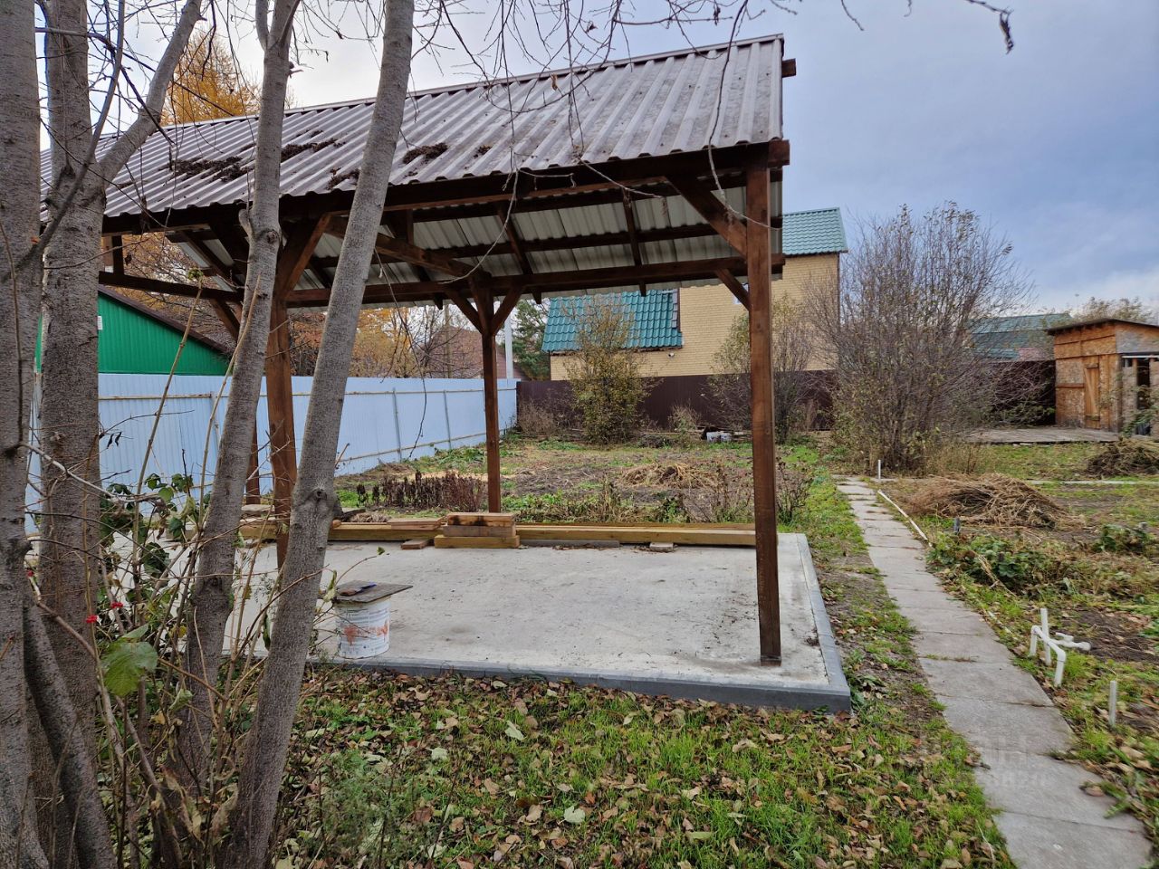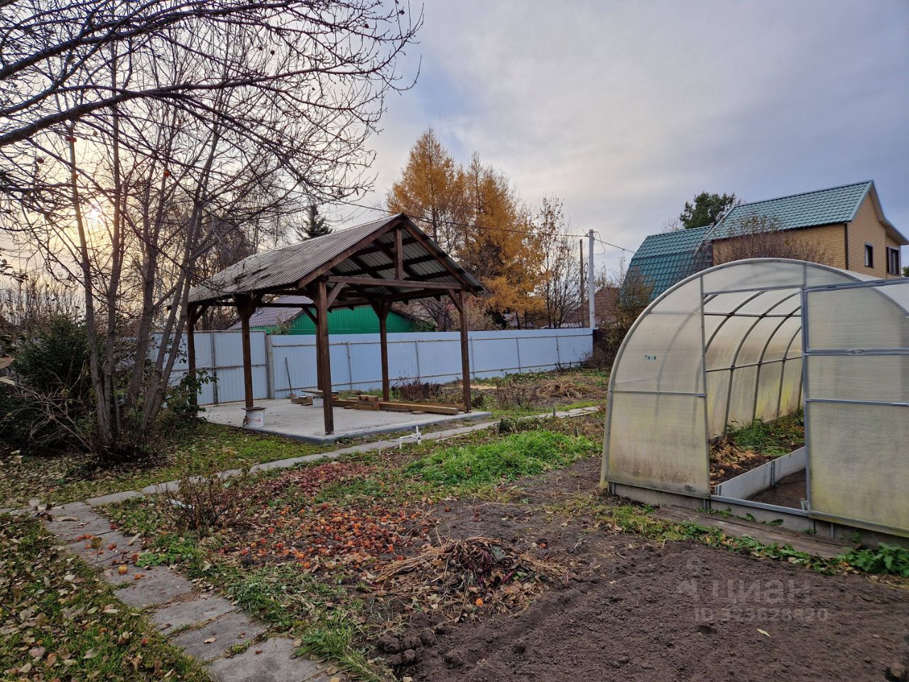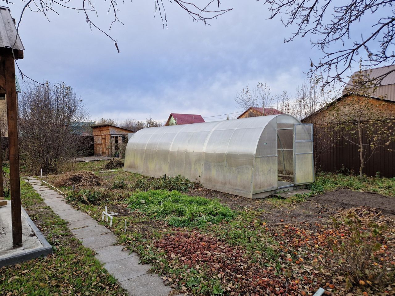 Участок правильной формы примерно 24 на 19. Разработан. Есть плодовые деревья, малина, смородина, крыжовник, клубника, вишня, яблоня. Дорожки бмп, теплица, навес, сарай, дровянник. Прямой въезд с улицы. До остановки 5 мин. Ходит школьный автобус. Газ и электричество рядом с участком.