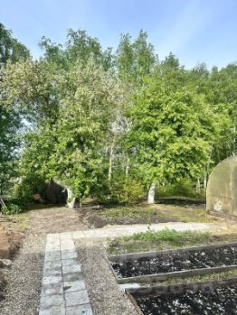 Растут яблоня, малина, крыжовник, смородина, вишня, земляника, виктория.