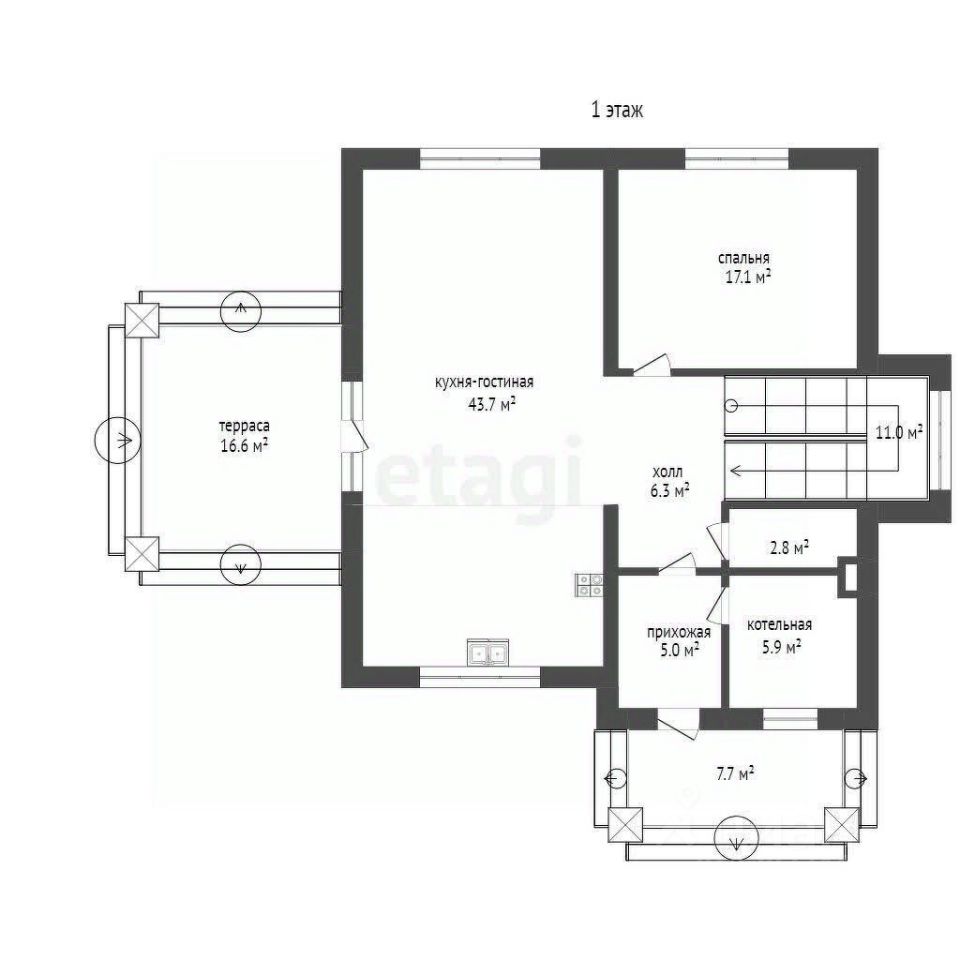 на первом этаже жилая комната 17 кв.м, просторная кухня-гостиная 43,7 кв.м