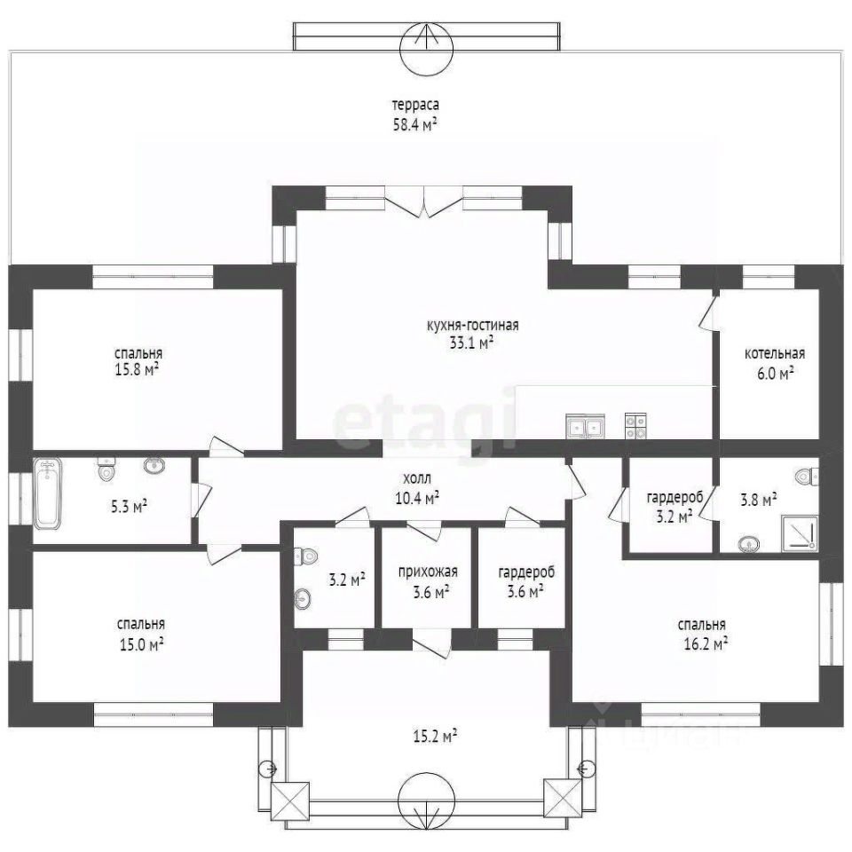 Отделка дома - черновая. В котельной установлен газовый котел и фильтр грубой очистки воды.