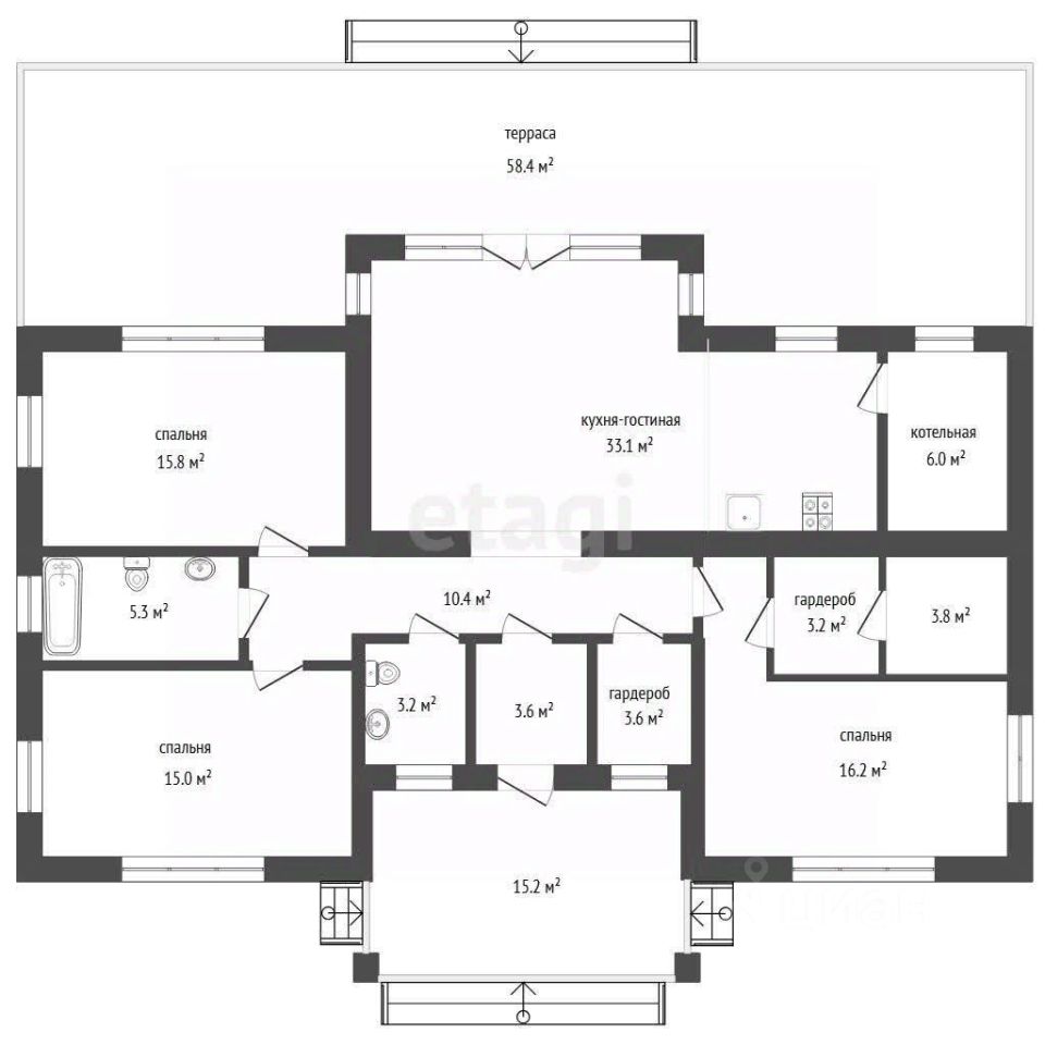 По планировке - две просторных спальни 15,8/15 , на эти две спальни предусмотрен свой санузел.