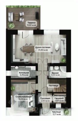 Фундамент: Монолитная плита из бетона марки М300 обеспечивает прочность и надежность основания дома. Армирование в два слоя делает фундамент устойчивым к нагрузкам и долговечным, что важно для комфортного проживания.