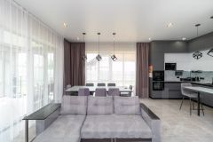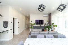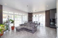 Планировка включает три спальни, просторную кухню-гостиную, современный санузел и ванную комнату, а так же просторную теплую закрытую вернаду. Высота потолков 3,2 м создает ощущение простора, а качественный ремонт по дизайн-проекту подчеркивает стиль и функциональность интерьера. Проведены все необходимые коммуникации: электричество, газ, септик. Дополнительные преимущества — высокоскоростной интернет с двумя роутерами для стабильного соединения и возможность приобретения дома с мебелью и техникой.