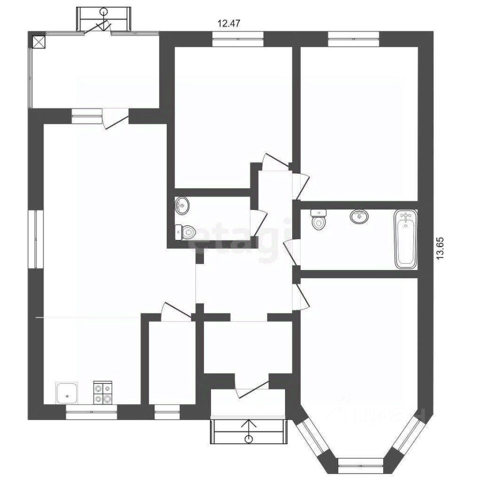 - Планировка: кухня-гостиная, 3 комнаты правильной квадратной формы, два санузла и утепленная отапливаемая терраса.