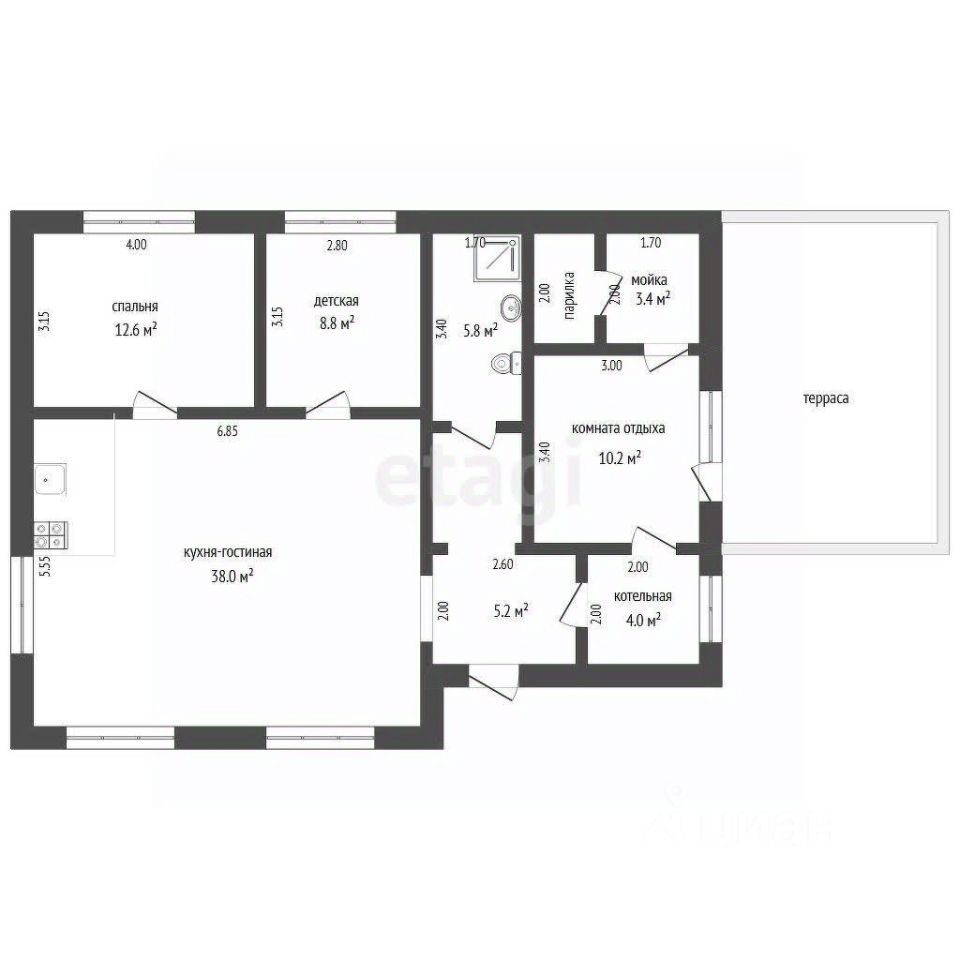 Планировка дома продумана для удобства жильцов: две спальни, просторная кухня-гостиная, санузел, баня и комната отдыха с выходом на террасу. Такое расположение помещений создает комфортное пространство для жизни и приема гостей. Участок позволяет разместить дополнительные постройки или обустроить зону для сада и огорода, предоставляя свободу для реализации личных предпочтений.
