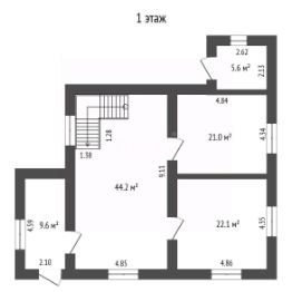 Планировка первого этажа включает объединенную кухню-гостиную, отдельную гостиную, жилую комнату (спальню) и санузел, что идеально для жизни и приема гостей.