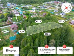 Участок площадью 10 соток, расположен в СНТ "Сундукуль", всего в 15 минутах от города (Велижанский тракт, 25 км от Тюмени).