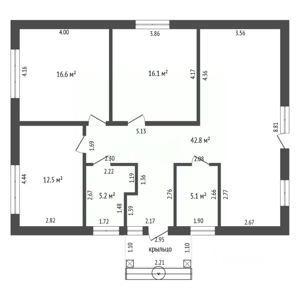 Кухня гостиная 43м2, 3 спальни 12м2, 16м2, 17м2, ванная 5м2, техническая комната 5м2.