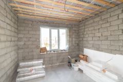 По дому разводка инженерных сетей - электричества, воды, канализации и отопления. Штукатурка стен.