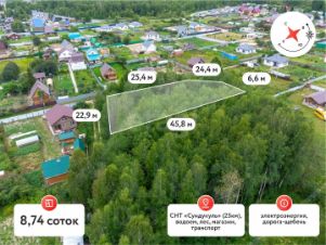 Участок площадью 8,7 соток, расположен в СНТ "Сундукуль", всего в 15 минутах от города (Велижанский тракт, 25 км от Тюмени).