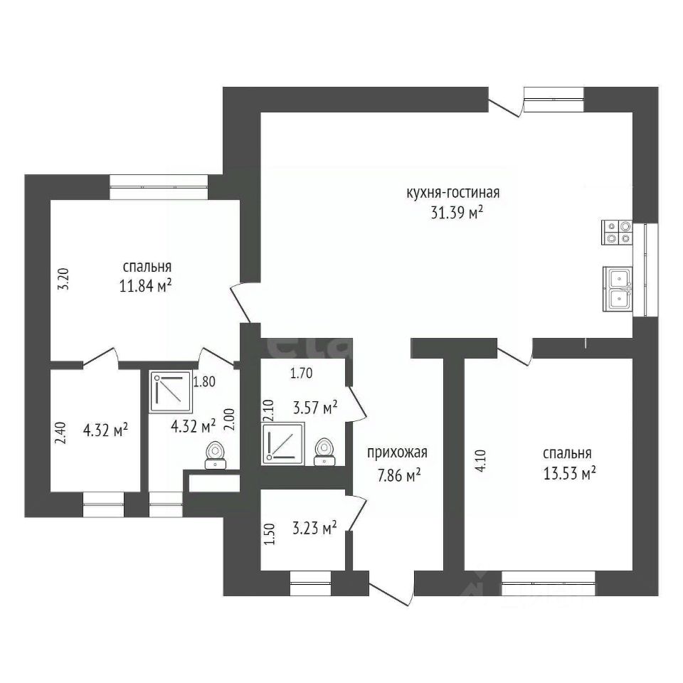 Общая площадь дома составляет 90 кв. м., что обеспечивает достаточное пространство для семейного проживания.