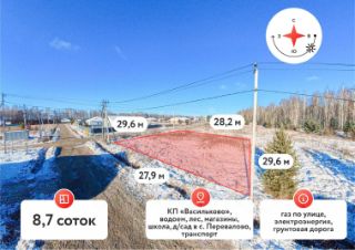 Продается земельный участок площадью 8.7 соток в коттеджном поселке "Васильково" в селе Перевалово. Размер участка по фасаду 29.7 м., в глубину 28 м. Участок отличается ровным рельефом и выгодным расположением: его задняя граница примыкает к березовой посадке, что обеспечивает приватность и отсутствие соседей с этой стороны. К участку подведены магистральные коммуникации — электричество и газ, что существенно упрощает и ускоряет процесс строительства. Ключевым преимуществом является развитая инфраструктура в шаговой доступности: через дорогу расположены школа, детский сад, медицинский пункт и магазины, что делает жизнь комфортной для семьи с детьми. Транспортная доступность высокая: рядом находится автобусная остановка, организован подвоз школьным автобусом, а выезд на широкий шестиполосный Московский тракт позволяет быстро добраться до объездной дороги и далее в любую часть города. Для отдыха в 2 км расположен пруд и рекреационная зона "Фиш Парк". Участок предлагает редкое сочетание уединенности, готовности к строительству и полной обеспеченности объектами социальной и транспортной инфраструктуры.