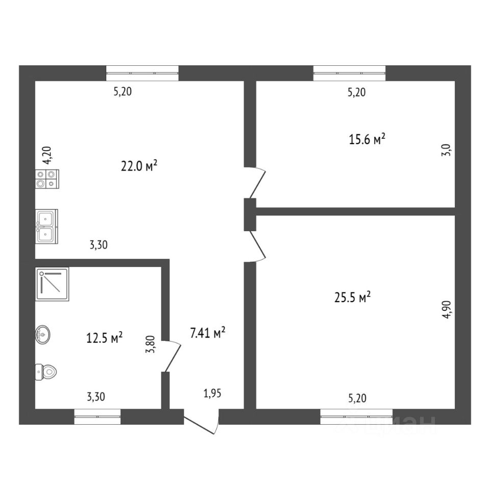 Удобная планировка: 2 спальные комнаты, просторная кухня-гостиная 22,0 кв.м.,1 санузел, 12,5 кв.м., прихожая 7,41 кв.м.