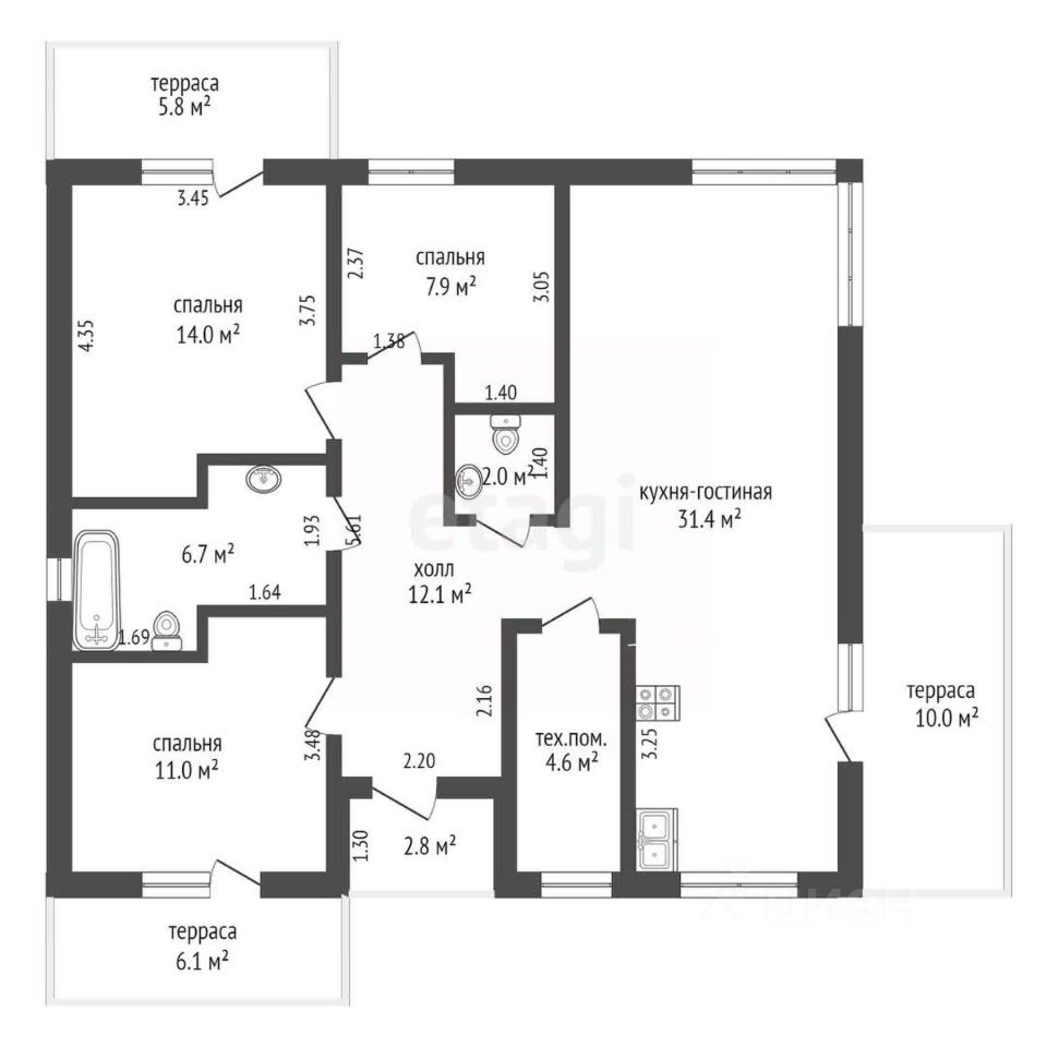 Площадь дома - 100 кв.м., участок - 9 соток!