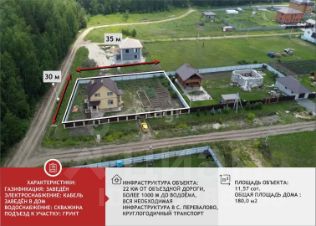 Дом построен из керамзитоблоков, утеплён пеноплексом (100), сверху облицовочный кирпич, крыша - металлочерепица. Все коммуникации заведены в дом: отопление от электрокотла; канализация - септик 10 кубов; водоснабжение из скважины . Возле забора выведен газовый стояк. Окна пластиковые. Участок огорожен забором из сайдинга и разработан, есть различные насаждения: яблони, груша, облепиха, смородина,крыжовник, ирга, клубника, малина, сирень и др. КП Ушакова относится к Переваловскому муниципальному образованию, что гарантирует наличие всей необходимой для комфортной загородной жизни инфраструктуры: школа (детей отвозит и привозит школьный автобус), д/с, почта, медицинское учреждение, сетевые магазины, аптеки и прочее. Рядом живописный лес и река Ушаковка. Дороги асфальтированы.