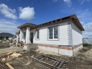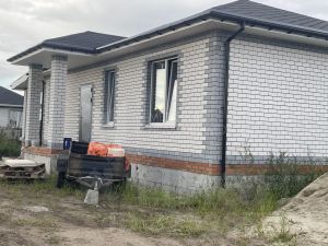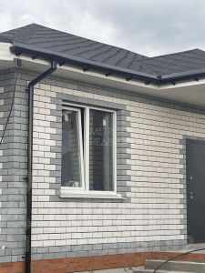 Дом выполнен из керамзитобетонных блоков, фасад облицован кирпичом, кровля -мягкая черепица.
