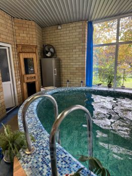 Дом 120м2, построен из бруса и кирпича, утеплен, для круглогодичного проживания. Потолки на первом этаже 2,7 метра. Две просторные комнаты, кухня- гостинная, с/у, бассейн (круглогодичное пользование), сауна. Есть действующий камин. Газ в дом заведен.