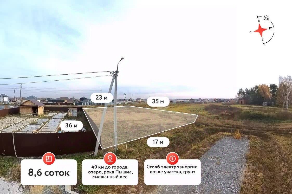 Продаётся земельный участок в живописном месте, расположенный в экологически чистом районе, в 40 км от города, в селе Успенка. Разрешённое использование участка — индивидуальное жилищное строительство (ИЖС). Это очень красивое и тихое место, рядом находятся озеро, река Пышма и смешанный лес. Здесь созданы отличные условия для любителей активного отдыха, рыбалки и других видов развлечений на природе.