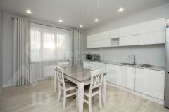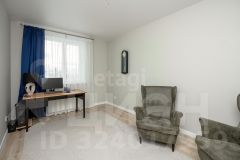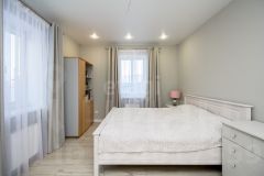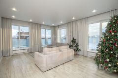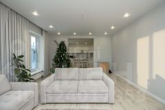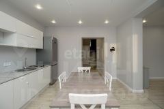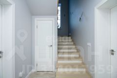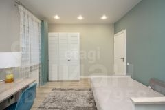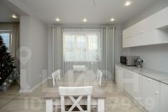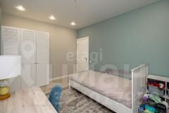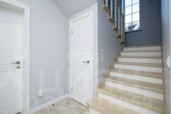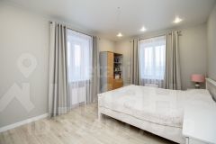 В доме 6 комнат, кухня, 2 санузла, котельная. Комнаты все изолированы, а кухня проходная. Под каждым окном размещен радиатор отопления. Стены во всем доме выровнены и окрашены. При отделке дома использовали нейтральные цвета. Шторы гармонично сочетаются с интерьером. Потолок ПВХ белый матовый. Установлены точечные светильники, также сделаны выводы для люстры. На первом этаже напольное покрытие ламинат, а на втором линолеум. Предусмотрены выводы коммуникаций под кухонный остров. Пол, а также перекрытия между первым и вторым этажом выполнены из плит ЖБИ.