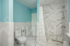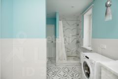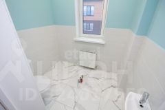 На первом этаже находится гостевой санузел. В нем предусмотрено окно. Оборудован электрический теплый пол. Через санузел попадаем в котельную. Установлен настенный газовый двухконтурный котел. От него подается и отопление и горячая вода.