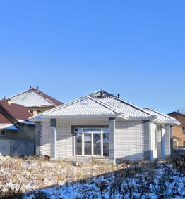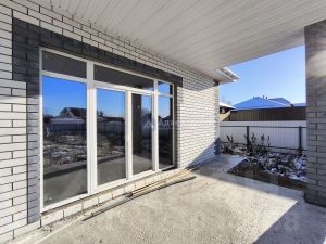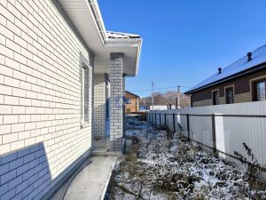 Материал дома - керамзитблоки+утеплитель+отделочный кирпич. Отмостка дома выполнена. Высота строения - 3.3 метра.