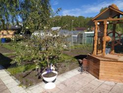 На участке есть две теплицы (3x6 м) и ухоженный огород с грядками, а также множество цветов и плодово-ягодных насаждений: яблони, груша, слива, вишня, черешня, малина, смородина и клубника.