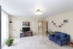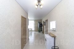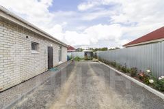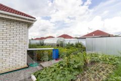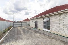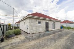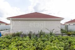 Фундамент: ленточный с залитой монолитной плитой, обеспечивающий прочность и долговечность.Наружные стены: блок поревит, облицованный кирпичом, что гарантирует теплоизоляцию и эстетичный внешний вид.Крыша: четырёхскатная, оборудована водосточными сливами для защиты от осадков.Окна: тройной стеклопакет для максимальной тепло- и звукоизоляции.Входная дверь: металлическая, надёжная и безопасная.Внутри: натяжной потолок, стены украшены жидкими обоями, пол — керамическая плитка.Межкомнатные двери: установлены современные двери.