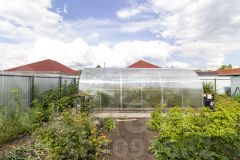 Теплица размером 3х6 метров и хозяйственный блок для хранения инструментов.Участок отсыпан,