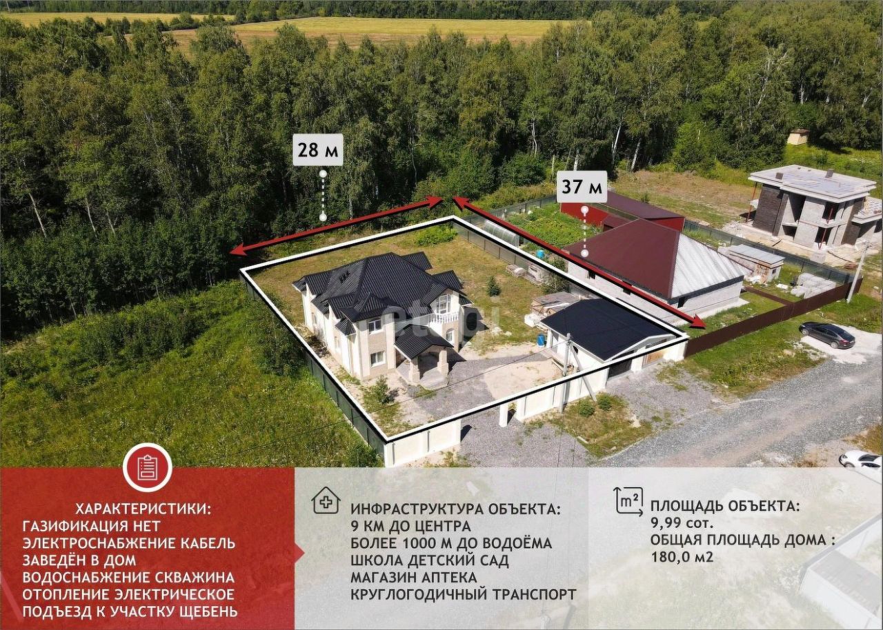 Коммуникации: электрическое отопление (котёл), септик 8 куб.м., своя скважина, газ подведен к участку.