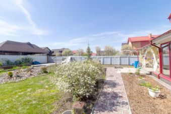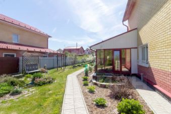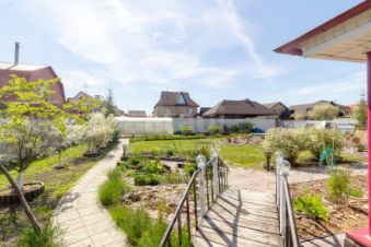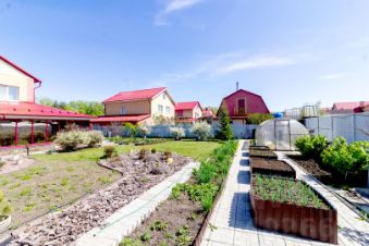 Благоустроенные дорожки из брусчатки, декоративные мостики, аккуратная подсветка, плодово-ягодные деревья, грядки и теплица создают атмосферу загородной идиллии.