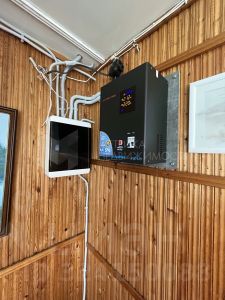 В доме стоит электрокотел, который включается с приложения на телефоне. Очень удбно - пока вы едете из дома, включили отопление и приехали в теплый дом. Установлен стабилизатор электричества, сигнализация.