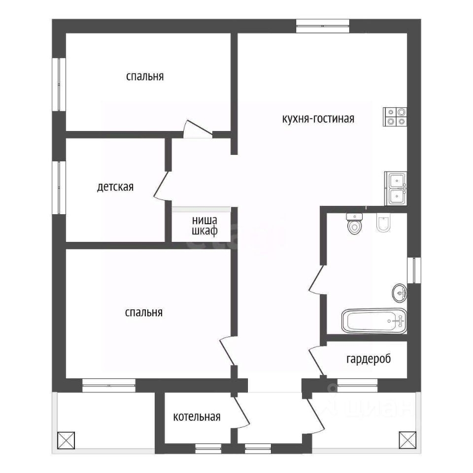 В доме три спальные комнаты, кухня-гостиная, санузел, котельная.