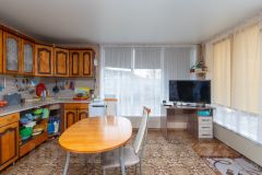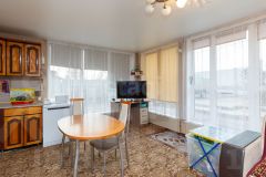 - большая кухня-гостиная с панорамными окнами, при продаже остается кухонный деревянный гарнитур, угловой диван;