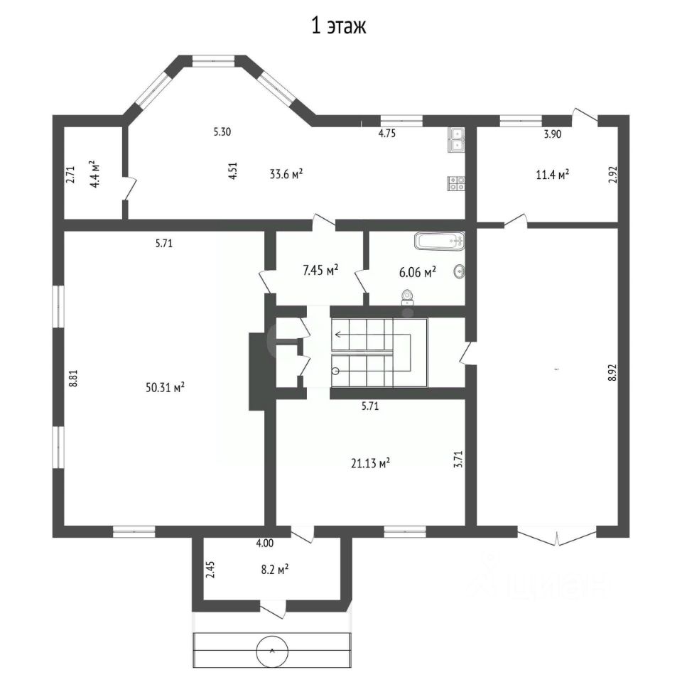 Планировка первого этажа включает в себя просторный холл, большую гостиную, кухню-столовую, совмещенный санузел. Из первого этажа организован выход в гараж, котельную и в цоколь.