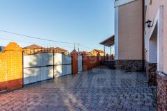 Участок со всех сторон огорожен забором, площадки и дорожки выложены брусчаткой.