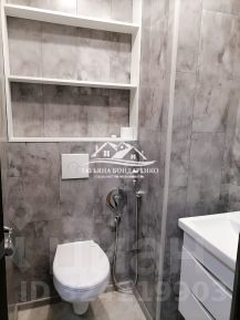 Санузел совмещённый, стены и пол выложены керамогранитом.