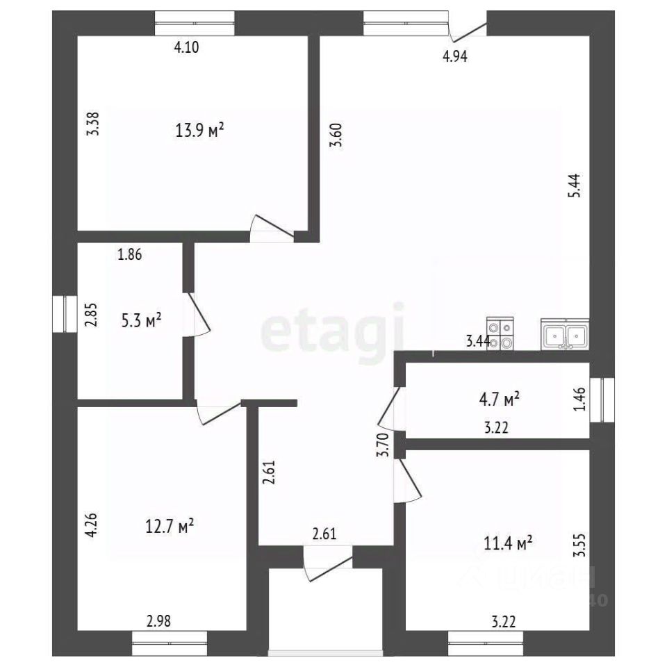 Дом площадью 95 кв. м на участке 7,74 сотки предлагает рациональное пространство для жизни: три изолированные спальни, объединенная кухня-гостиная, совмещенный санузел, котельная и кладовая.
