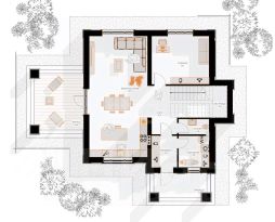 на первом этаже жилая комната 17 кв.м, просторная кухня-гостиная 43,7 кв.м