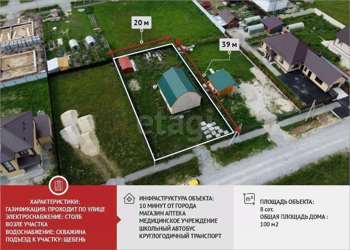 Участок площадью 8 соток обеспечит свободу творчества и возможности обустройства сада или огорода. Рядом расположены остановки общественного транспорта, включая школьный автобус, что значительно упрощает логистику.Для удобства жителей посёлка функционируют продуктовые магазины, аптека, медицинский ФАП и даже собственный культурный центр "Родник".Посёлок постоянно развивается, строится современная дорожная инфраструктура, создаётся благоприятная среда для проживания семьи с детьми.
