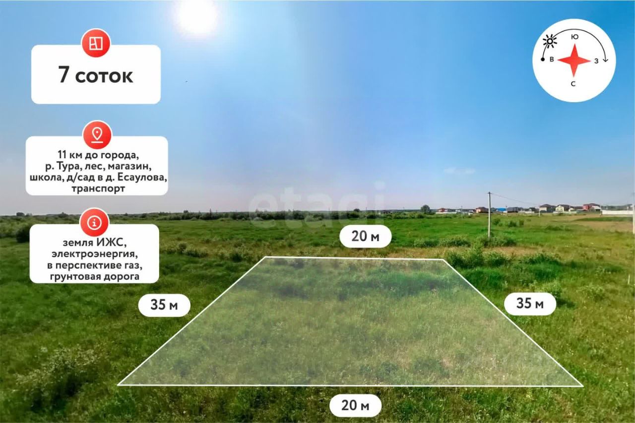 Продается земельный участок 7 соток ИЖС, расположенный в коттеджном поселке "Клюква" вблизи деревни Есаулово, по Старому Тобольскому тракту. Идеально подходит для строительства дома, так как назначение земли ИЖС. Подъездные пути отсыпаны песчано-гравийной смесью, улицы широкие, вдоль улицы проходят линии электропередач. В поселок заведен газ. Рядом с участком активно развивается жилая застройка. С каждым днем популярность коттеджного поселка набирает обороты, соответственно рост цены и спроса гарантирован!!! Вблизи поселка находятся деревни Есаулово и Якуши, в которых уже сейчас активно развита вся инфраструктура, необходимая для постоянного проживания (школа, детский сад, фельдшерско-акушерский пункт, а также аптеки и магазины).Полное юридическое сопровождение, помощь в получении ипотеки и оформлении подряда на строительство дома от застройщика.