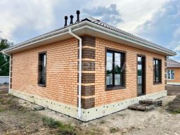 Фундамент дома свайно-ростверковый с усиленным армо-каркасом, перекрыт пустотными плитами. По периметру дома выполнена мягкая отмостка. Наружные стены дома выполнены из облицовочного керамического кирпича и керамзитоблока 300 мм с утеплителем пенопласт 100мм. Сверху стены завершаются армо-поясом с усиленным армокаркасом.
