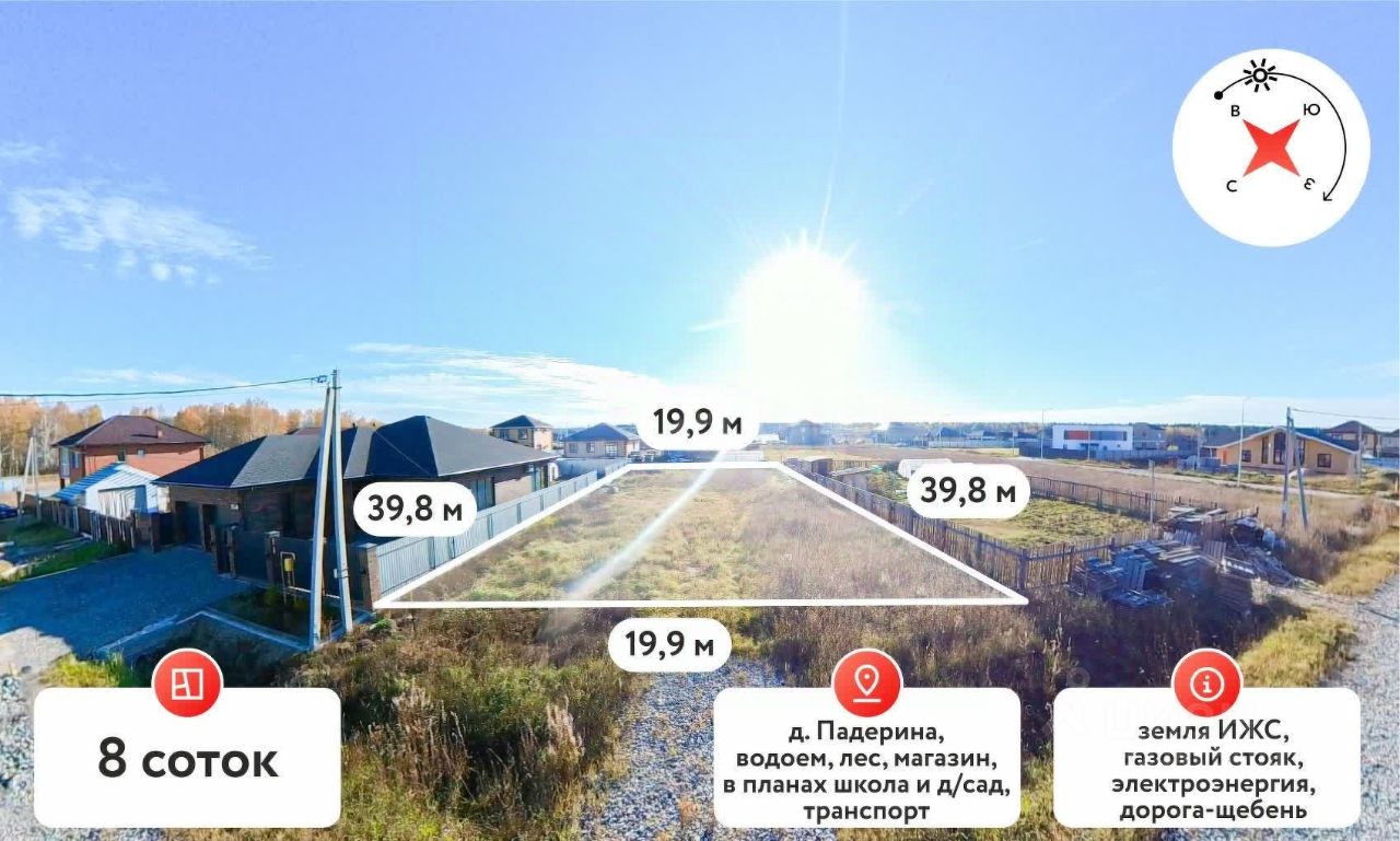 Участок 8 соток расположен в деревне Падерина. С одной стороны есть забор, соседи построились. Подъездная дорога к участку выполнена из щебня, а центральная трасса имеет асфальтовое покрытие, гарантируя удобную транспортную доступность в любое время года. В шаговой доступности, всего в 200 метрах, расположена автобусная остановка и недалеко супермаркет "Магнит" для повседневных покупок. Вся основная социальная инфраструктура, включая Московскую среднюю школу, детский сад и врачебную амбулаторию, находится в соседнем поселке Московский, что делает эту локацию практичным выбором для семейной жизни. Ключевым преимуществом является перспектива развития территории: в ближайшее время запланировано строительство новых дорог, которые напрямую соединят деревню Падерина с Тюменью, что значительно увеличит транспортную доступность и потенциальную инвестиционную привлекательность объекта. Участок идеально подходит для возведения капитального дома для круглогодичного проживания в экологически спокойной локации с развитой бытовой инфраструктурой, а также представляет собой стратегический актив для вложения средств с расчетом на рост стоимости земли в связи с развитием дорожной сети и приближением к городской черте.