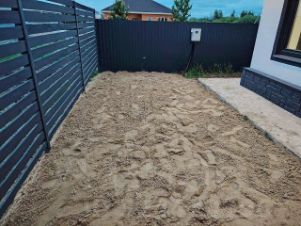 Участок правильной формы, очень высокий (гораздо выше соседей)окружен забором из профнастила, ворота откатные автоматические (на пульте).