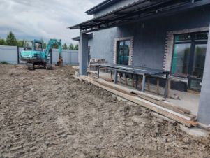 Дом построен из газоблоков типа "поревит", перегородки также из газоблоков, наружная штукатурка "короед". Фундамент - монолитная плита 350 мм.