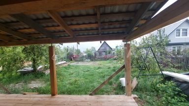 1 этаж: сруб 3х6 -бpевно, к нему пристрой из 150 бpуcа 3x6, откpытaя вepaндa c навeсом 3x6