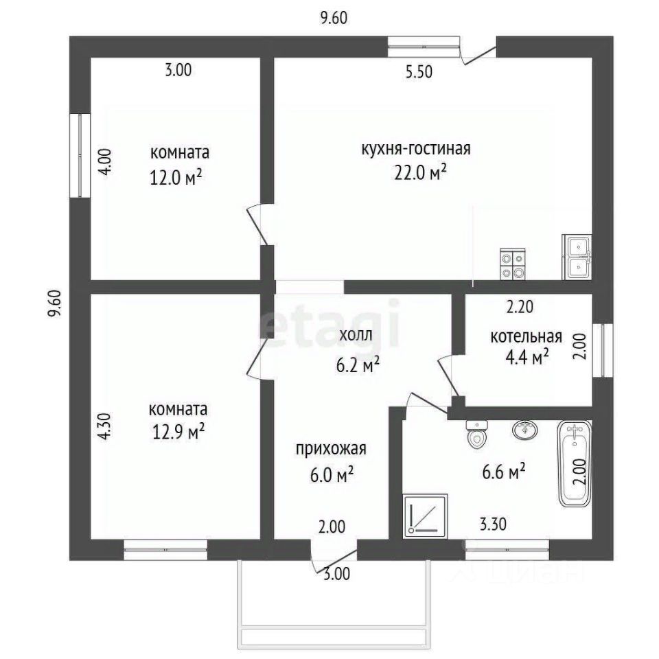 В доме удобная планировка: большая кухня-гостиная с выходом на террасу, 2 просторные спальни, большой санузел, котельная и прихожая с местом под гардеробную.