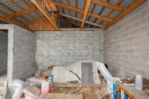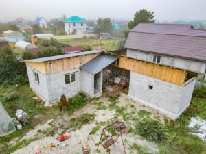 Дом с баней соединен террасой под одной крышей Г-образной формы, керамзит блок. В доме кухня-гостиная, спальня, бойлернаятуалет.