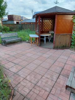 На участке расположена деревянная баня, беседка и выложена из кирпича зона барбекю (печь), поликарбонатная теплица, сарай, колодец и скважина.