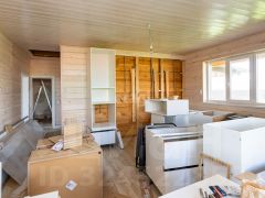 В доме выполнен свежий современный ремонт, на полу ламинат высокого класса , стены обшиты деревом (покрашены), установлены двери. Привезен кухонный гарнитур (остается при продаже)