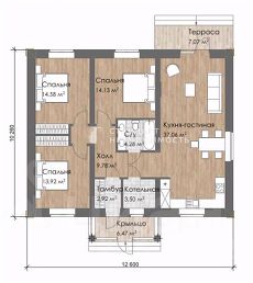 Размер 10,2х12,6м из газоблока 400 мм, облицовка - кирпич, армопояс, кровля металлочерепица, фундамент - утеплённая шведская плита УШП, по всей площади стяжки уложен трубопровод из полиэтилена систем горячего водоснабжения и отопления.